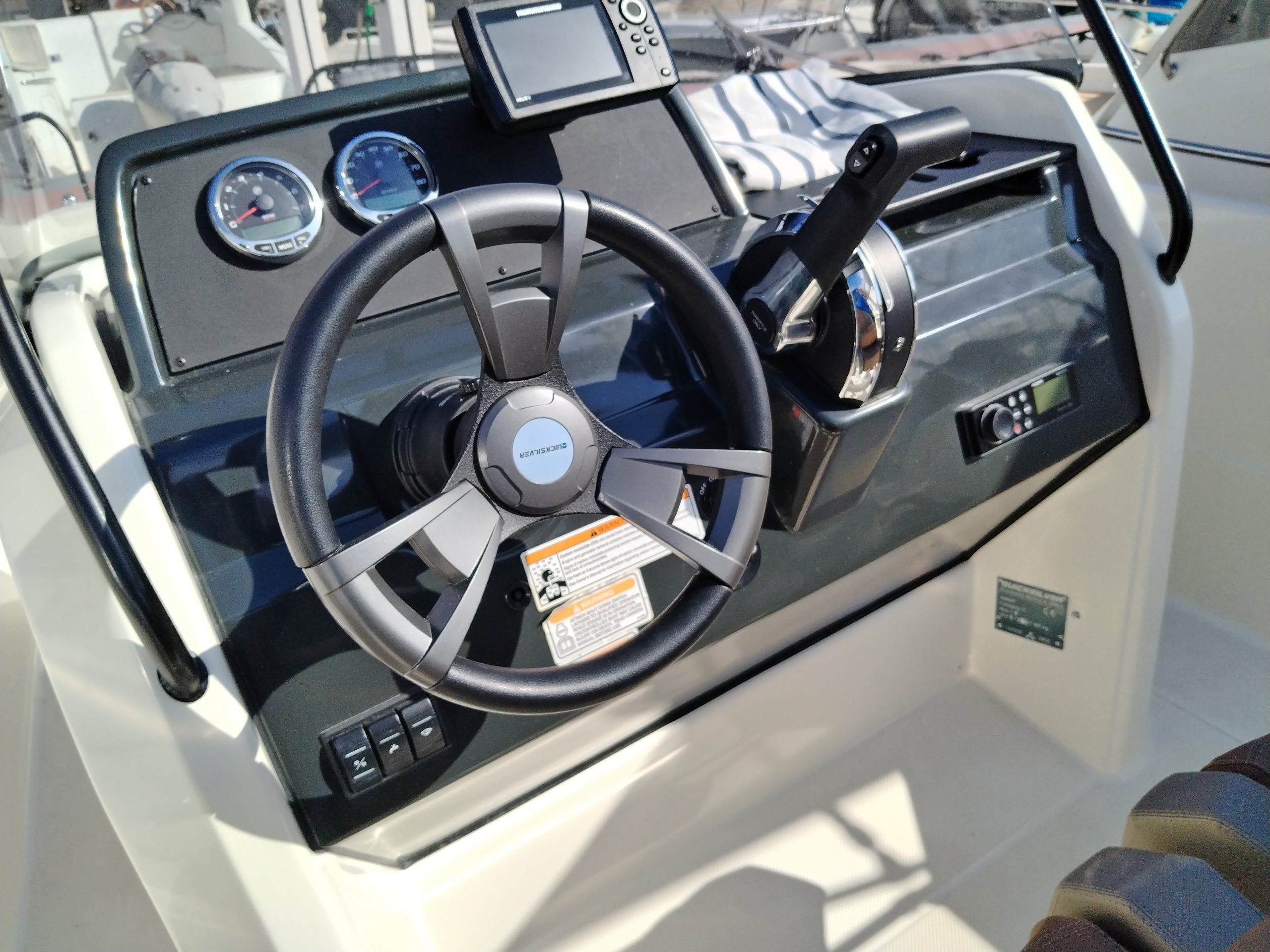 El diseño de esta Quicksilver 605 Open ofrece un uso versátil tanto para familia como para jornadas de pesca o actividades náuticas. Su distribución inteligente permite disfrutar de una cubierta amplia, solárium convertible en proa, bañera cómoda y una consola central que facilita una navegación segura y cómoda.